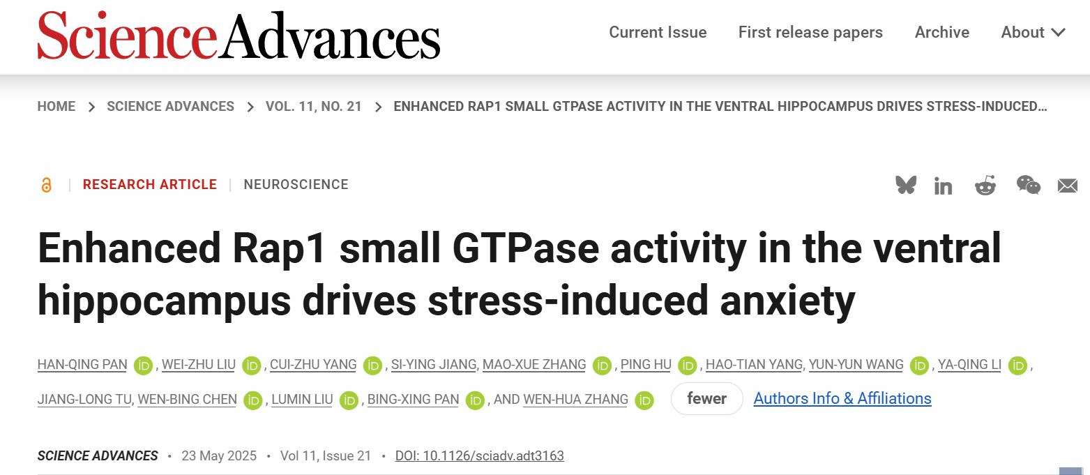 本網(wǎng)訊(生物醫(yī)學(xué)創(chuàng)新研究院、基礎(chǔ)醫(yī)學(xué)院)近日,我校生物醫(yī)學(xué)創(chuàng)新研究院/基礎(chǔ)醫(yī)學(xué)院潘秉興課題組與張文華課題組合作在綜合性期刊Science Advances上發(fā)表了題為“Enhanced Rap1 small GTPase activity in the ventral hippocampus drives stress-induced anxiety”的研究論文。該研究揭示了腹側(cè)海馬區(qū)錐體神經(jīng)元中小G蛋白Rap1的異常激活是介導(dǎo)慢性應(yīng)激誘發(fā)焦慮樣行為的重要分子機制。