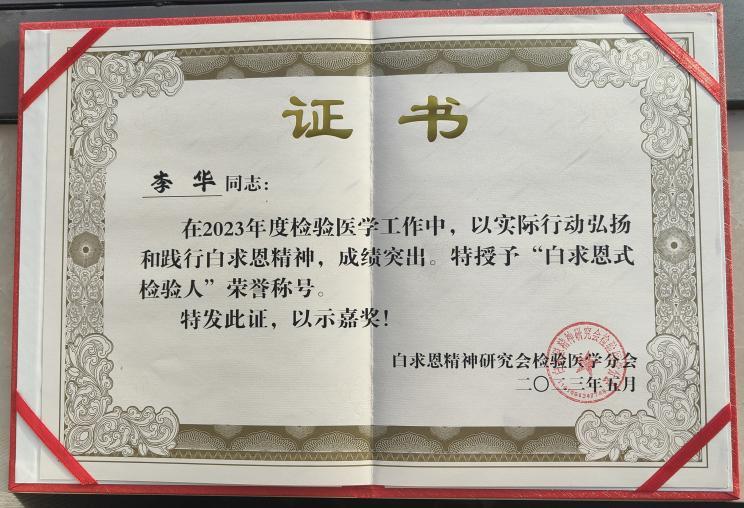 “白求恩式檢驗(yàn)人”由白求恩精神研究會(huì)、白求恩精神研究會(huì)檢驗(yàn)醫(yī)學(xué)分會(huì)聯(lián)合評(píng)審產(chǎn)生,旨在全面弘揚(yáng)“毫不利己、專門利人、無(wú)私奉獻(xiàn),對(duì)工作極端熱忱、精益求精”的白求恩精神,表彰在“白求恩式檢驗(yàn)科、白求恩式檢驗(yàn)人”等尋訪活動(dòng)中涌現(xiàn)的先進(jìn)個(gè)人。此次全國(guó)共15人榮獲“白求恩式檢驗(yàn)人”榮譽(yù)稱號(hào),李華是2023年度江西省唯一獲此殊榮的檢驗(yàn)人。