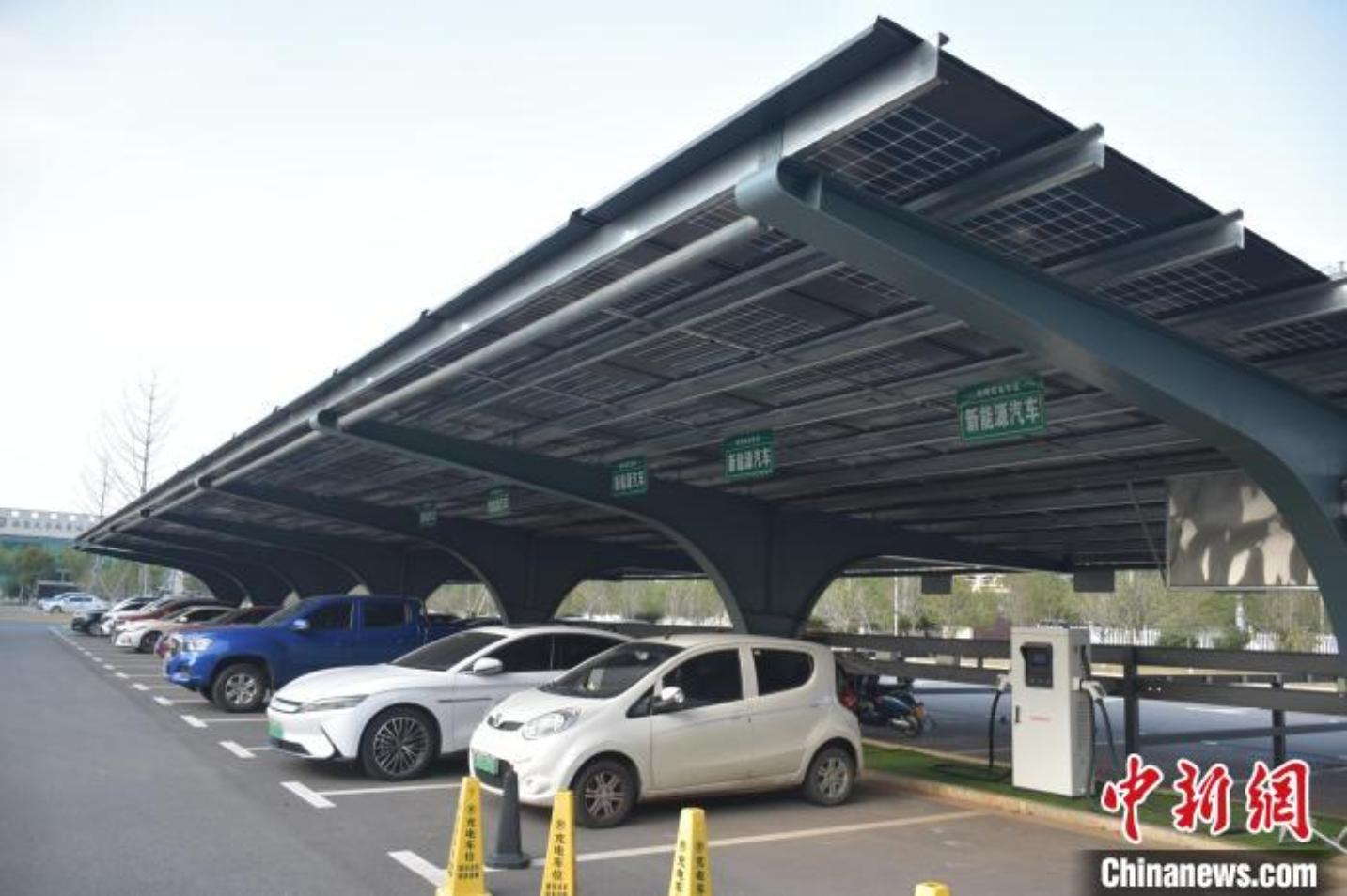 圖為南昌大學共青城光氫儲技術研究院內,新能源汽車停在光氫儲智能互補示范充電站充電。巫發陽 攝